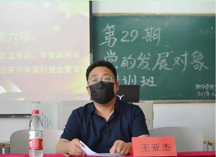 为深入贯彻落实习近平新时代中国特色社会主义思想,端正入党动机,深入推进党史学习教育。软件学院于2022年5月4日在次教408教室,开展第29期党的发展对象培训班开班仪式。软件学院党总支书记、学管副院长王亚杰院长,学生党支部组织委员周玉妹老师,团总支书记于录老师,21级年级组长蒙翠平老师以及本期培训班的全体学员出席会议。会议由学生党支部宣传委员杨海莲老师主持。