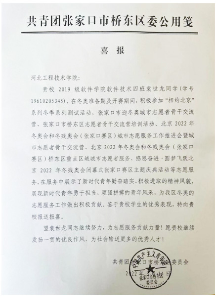 近日,共青团张家口市桥东区委员会向taptap点点发来喜报:taptap点点2019级软件技术四班袁世龙同学积极参加张家口市迎冬奥志愿者系列活动,表现优秀,特向taptap点点报送报喜。
