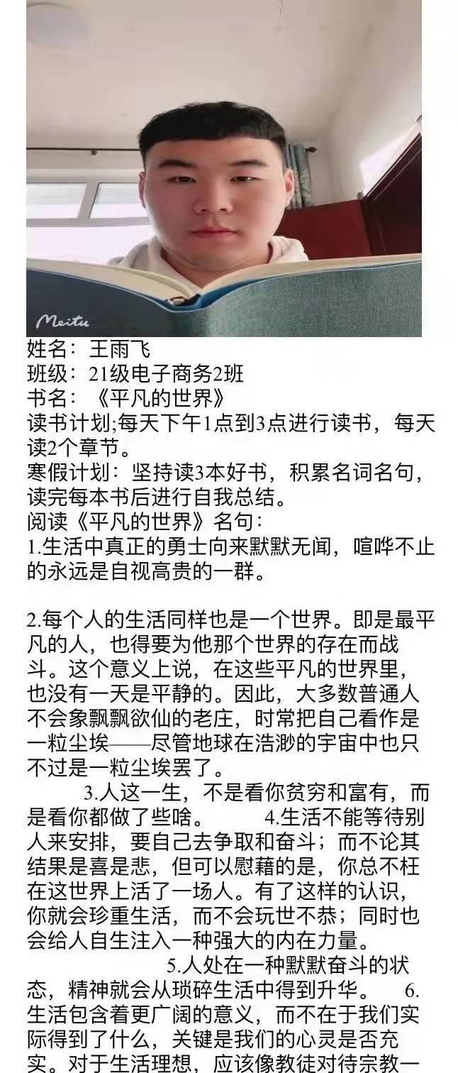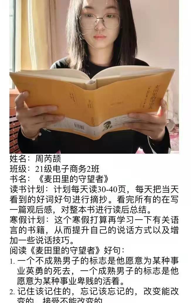 读书从来不是无用功,不读书就没有真正的学问,也不可能有欣赏能力、文采和广博的知识。同学们,我们的寒假生活已经开始,但我们的读书活动也不应停歇,让我们积极响应学院的“漫步书海,品读人生”活动,推进学院“43365读书”工程,投身到书本的海洋中吧!