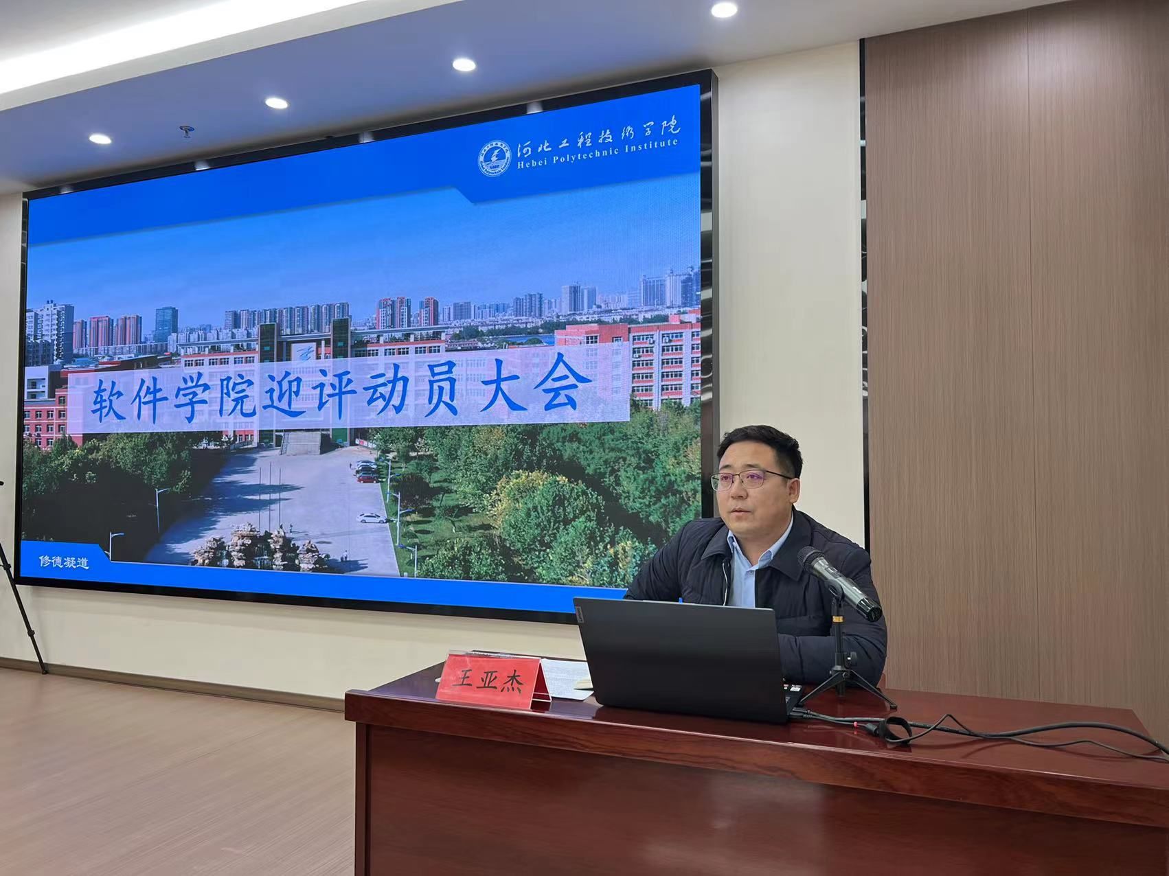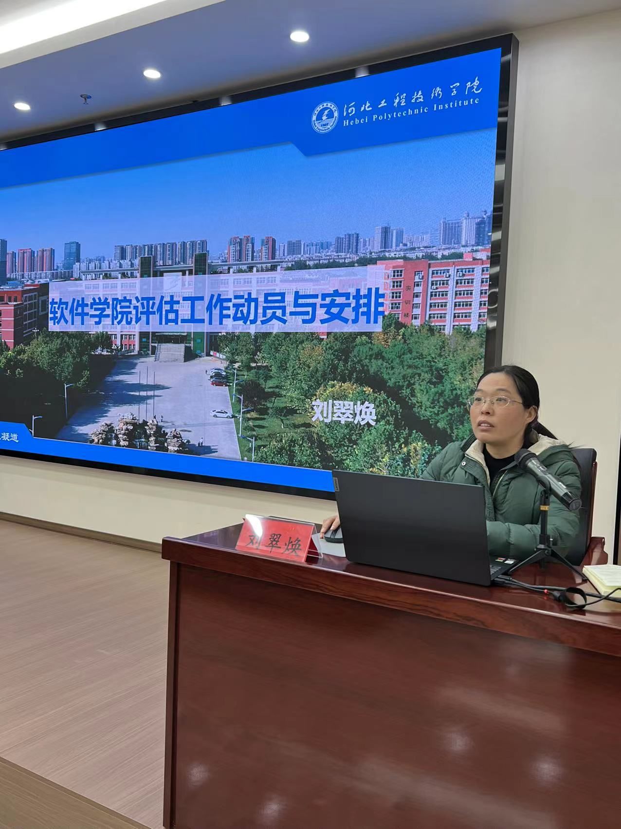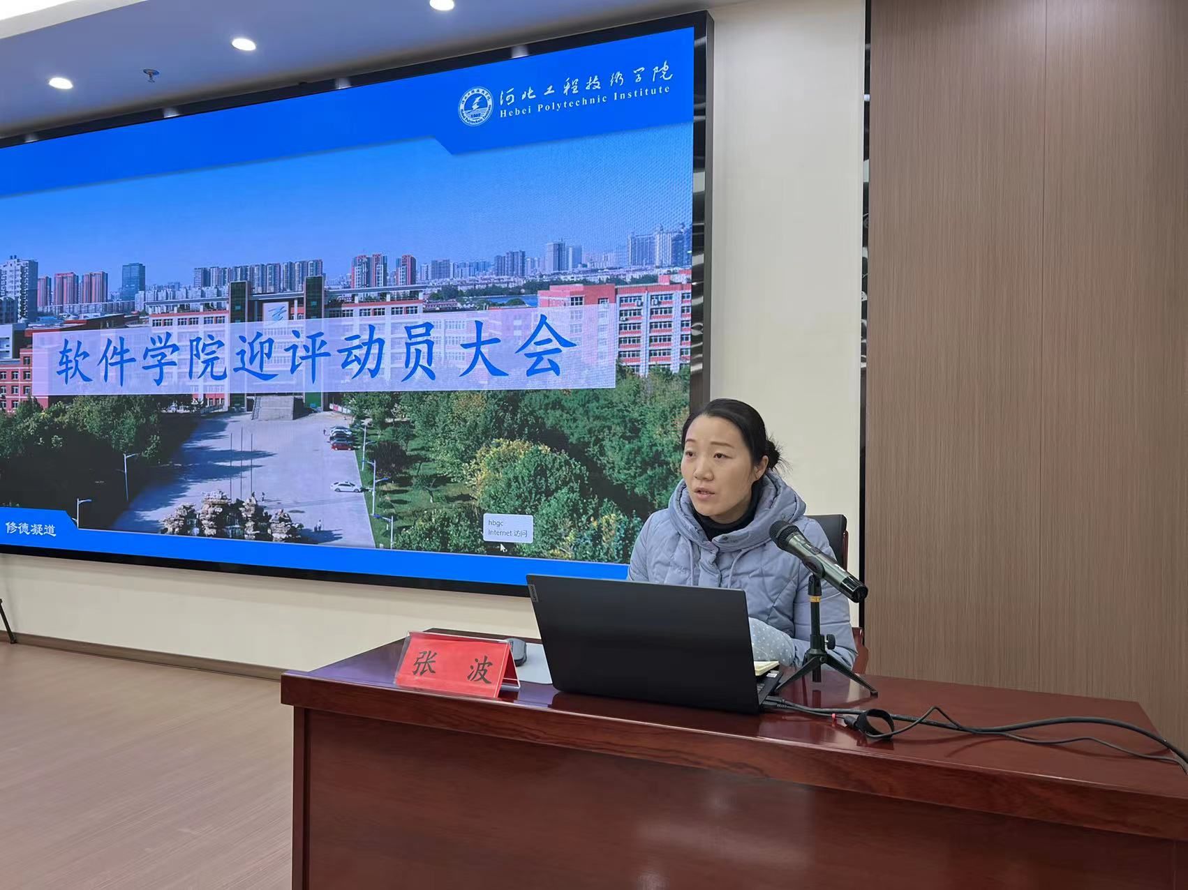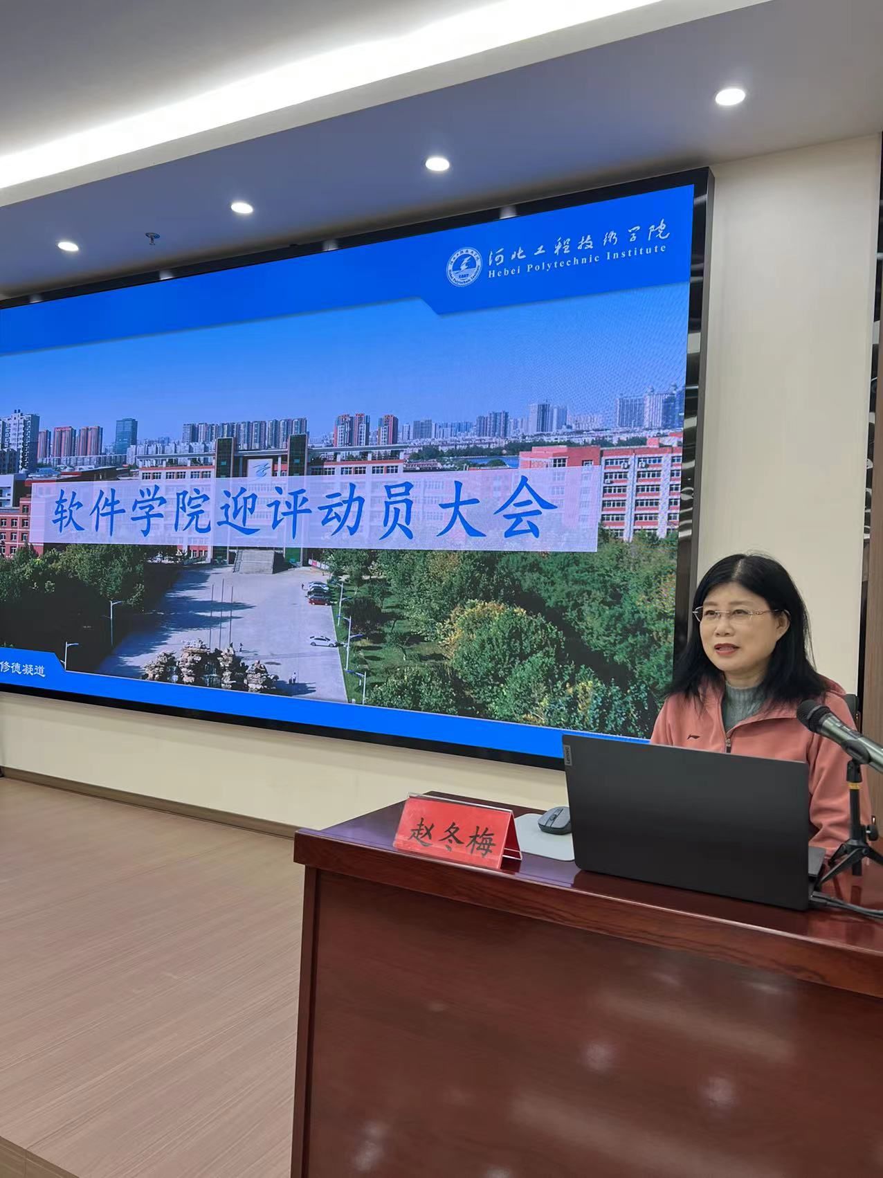 软件学院院长赵冬梅在会上从思想上高度重视;行动上高度配合;具体11条要求等三个方面对学院迎评工作提出要求,并作动员讲话。随后,教学副院长刘翠焕、张波分别就评估工作任务细化分解、校企合作与实验室建设及实习实训方面做了工作强调。最后,学管副院长、党总支书记王亚杰就党建、学生管理、工会工作结合评估重点进行整体通报,并提出明确要求。