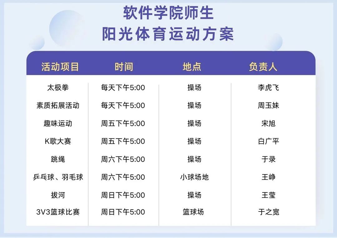 提倡积极健康的生活方式,坚持定时锻炼,自觉养成健康的作息习惯。根据“因人而宜、适时适度”原则,根据自身特点与兴趣爱好的慢跑、快走、太极拳、交谊舞、乒乓球、羽毛球等健身活动,走出教室,走向操场,拥抱阳光,积极参与体育锻炼。