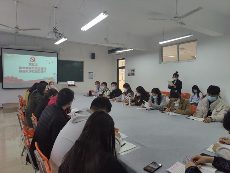 第二项议程学生党支部组织生活会暨民主评议党员:会上,党支部书记刘聪聪同志代表学生党支部班子汇报工作情况和上一年度专题组织生活会整改落实情况,并对照检查汇报上一年度工作概况、存在的主要差距和问题、深入剖析问题产生的原因、今后的努力方向和改进措施四个方面的情况。随后,参会党员同志依次进行了深刻、全面的自我批评及相互批评,大家放下了思想包袱,“讲真话”、“讲实话”、“揭短亮丑”,大家在表态中也一致表示,批评和点评意见总体客观公正、针对性强,找到了自身的不足短板,明晰了努力提高的方向,很好地增进了感情和团结。