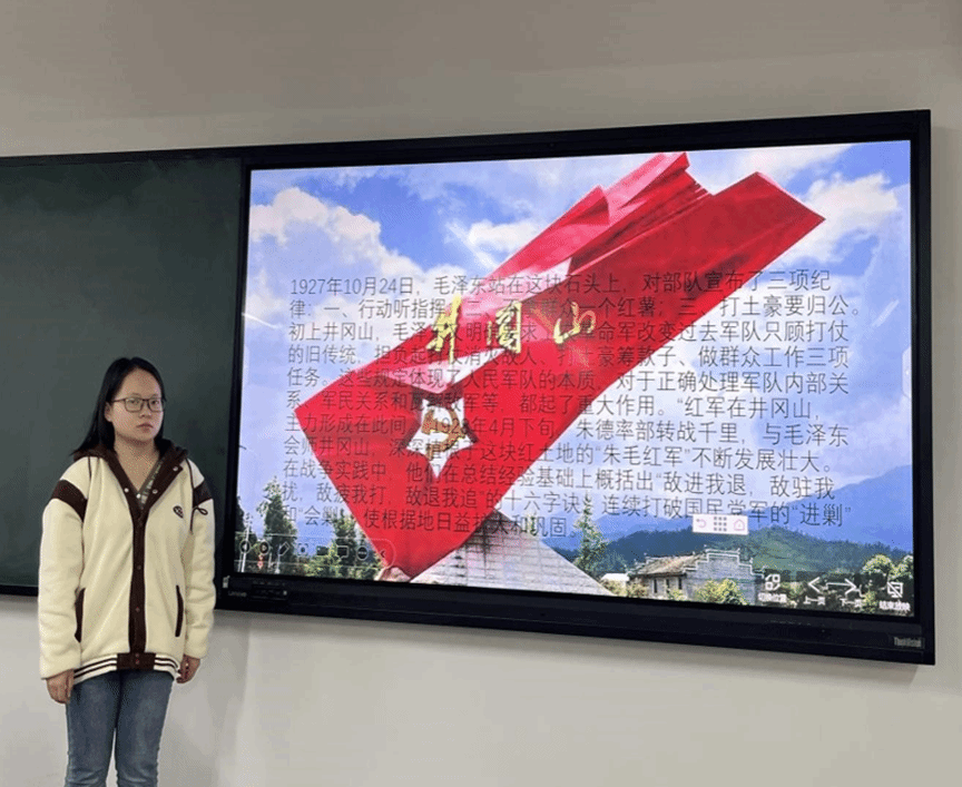 2022级网络空间安全3班吴会霞同学讲解了建立井冈山革命根据地的意义。大革命失败后,在全党为寻找中国革命新道路而进行的艰苦探索中,毛泽东率领湘赣边界秋收起义部队上井冈山,进行创建革命根据地、开展工农武装割据的斗争,开辟了中国革命新道路,代表了中国革命发展的正确方向。井冈山革命根据地的创建,是中国革命斗争史上的伟大创举,开辟了建立农村革命根据地,以农村包围城市、武装夺取政权的正确道路,开启了马克思主义基本原理同中国具体实际相结合的伟大进程,孕育了坚定信念、艰苦奋斗,实事求是、敢闯新路,依靠群众、勇于胜利的井冈山精神,成为中国革命不断走向胜利的光辉起点。这一伟大实践,对中国革命道路的探索,对中国共产党和人民军队成长具有关键意义。