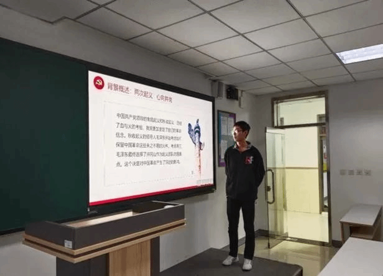 2022级网络空间安全2班李峥同学介绍了在四周白色政权的包围下,有一小块或若干小块红色政权的区域长期地存在的五个原因。分别是中国是一个被帝国主义间接统治的经济落后的半殖民地大国;中国若干省区曾在大革命中受过影响,这就为红色政权首先在这些地方发生并长期存在提供了群众条件;中国社会的各种矛盾随着帝国主义侵略的加剧和国民党反动统治的加强日趋激化,全国革命形势是向前发展的,所以小块红色区域不但能长期存在,而且将随之继续发展;相当力量的正式红军的存在;共产党组织的有力量和政策的正确。