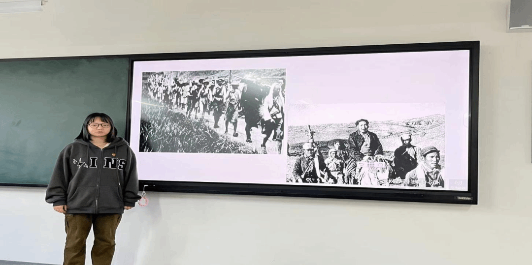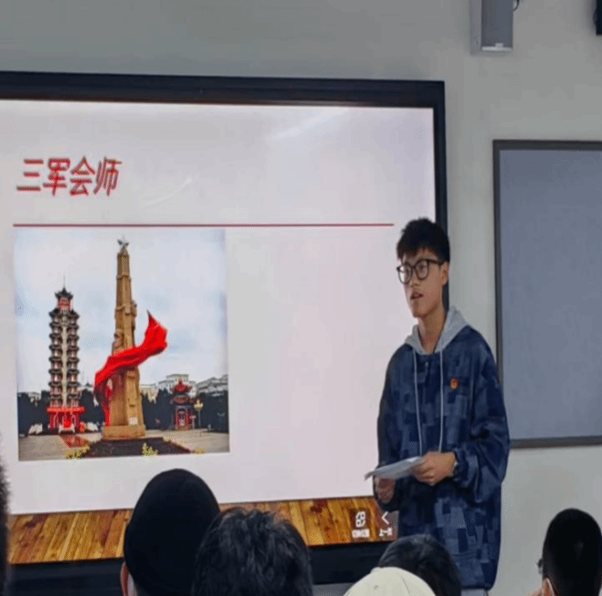 网络空间安全二班的王雅鑫同学则讲述了长征过程中的一件故事:过草地时,粮食紧缺,只有一点青稞面当军粮,小战士吴开生饿了两天的事被周副主席知道后,他立即把自己省下的青稞面分给他了两碗。晚上狂风暴雨,用被单做的帐篷根本经不起风⾬的袭击,战⼠们全部被淋成落汤鸡,周副主席亲⾃去命令战⼠们去他的办公帐篷避⾬,温暖了战⼠们的⼼灵。在草地中⼜⾛了好⼏天,青稞⾯吃完了,甚⾄军马都被杀掉吃了,战⼠们唯有煮⽪带啃,找纸张咽,看到这种极度的困境,周副主席⽴即命令警卫员把他仅存的半碗青稞⾯拿出来给⼤家泡汤喝,⾃⼰却忍饥挨饿。