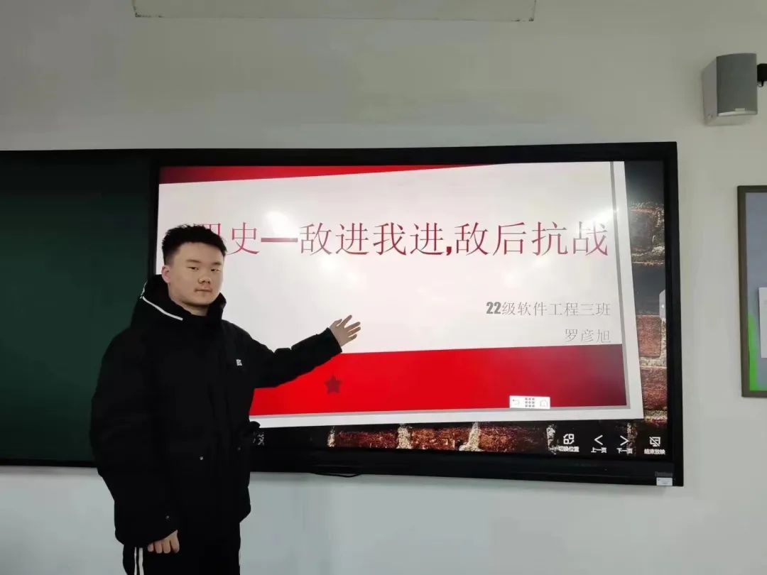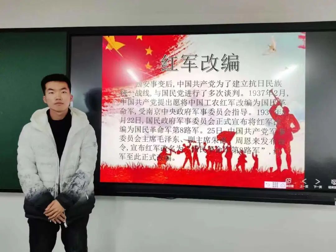 网络空间安全二班的李亚雯同学向我们着重讲解了红红军改编的历史背景:正是因为卢沟桥事变的爆发促进了红军向八路军和新四军的改编。网络空间安全三班的李帅兵同学则向同学们介绍了卢沟桥事变的时间:1937年7月7日、地点:北平。软件工程一班的秦佳赫同学给同学们介绍了本章节中所涉及的英雄人物。软件工程二班的张天祥同学向大家介绍了平型关大捷:又称平型关战役、平型关伏击战,是1937年9月25日,为配合友军作战,阻挡日军攻势,由八路军第115师师长林彪、副师长聂荣臻指挥,在山西省大同市灵丘县平型关附近,首次集中较大兵力对日军进行的一次成功伏击战,是抗日战争全面爆发以来中国军队的第一个大胜仗,也是在抗日战场上中国军队第一次主动向日军发动攻击并取得全胜的战斗。软件工程三班的赵何达同学则重点总结了红军改编,平型关大捷的历史意义。