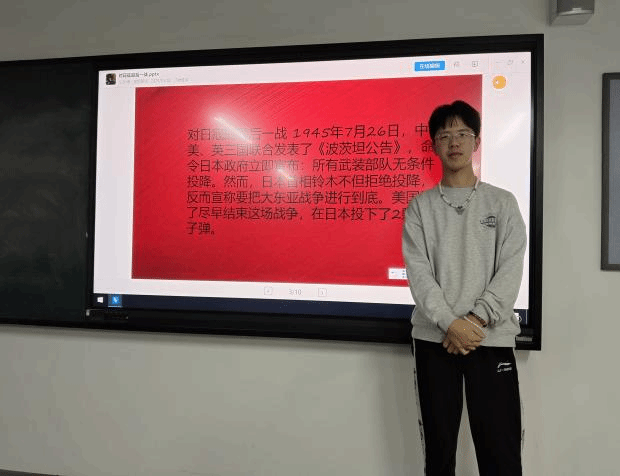 软件工程三班的李萌同学主要讲述了中国抗日战争最后一战:高邮战役。1945年8月15日,日本宣布无条件投降。9月2日,同盟国举行日本投降签字仪式,标志着中国抗日战争暨世界反法西斯战争取得最后胜利。9月3日被定为中国人民抗日战争胜利纪念日。然而很多人不知道的是在这之后中日还爆发了一战,这就是高邮战役,它是中国抗日战争最后一役。