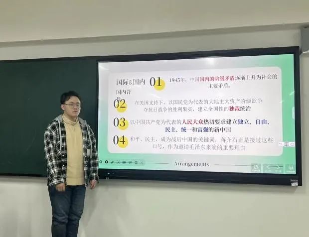 2022级软件工程一班冯晨阳同学讲到了重庆谈判的重大意义,此次会议表明国民党承认了中国共产党的地位,使得中共关于和平建设新中国的政治主张被全国人民所了解,由此推动了全国和平民主运动的发展。2022级软件工程二班李欣怡同学对当时的国内背景,国民党与共产党的想法与会议后的做法进行了讲解,让同学们对当时的时局有了更深的认识。2022级软件工程三班李梦雪同学在最后整体总结了该会议的影响,表明了中国共产党争取民主和平的决心与诚意。
