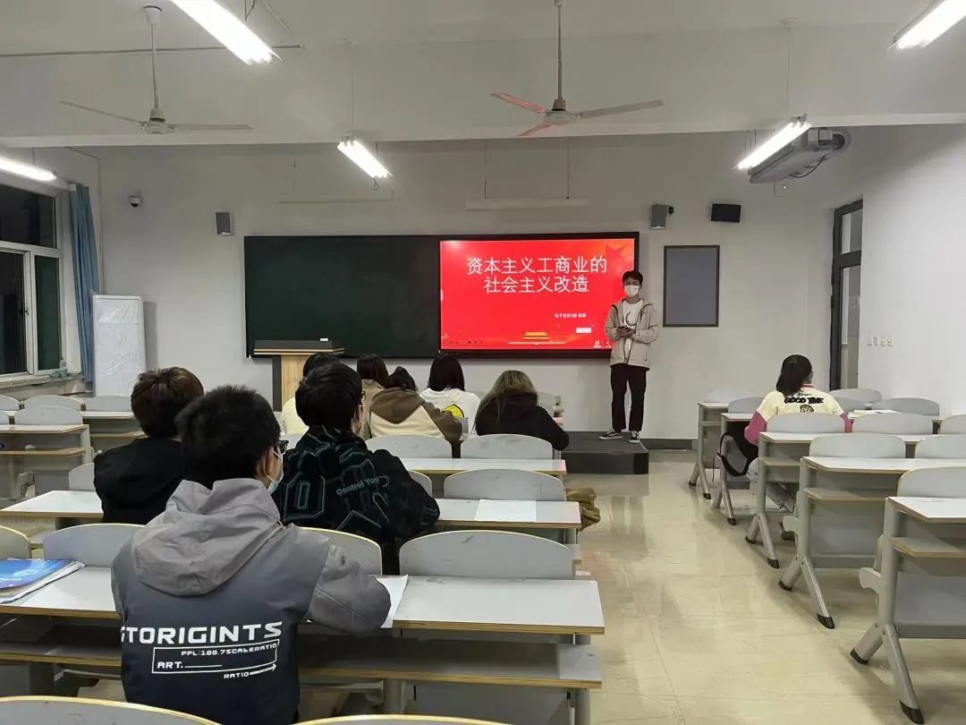 软件工程四班的张钊硕同学讲到了政治原因是对资本主义工商业进行改造的决定因素,其次,实行资本主义工商业的社会主义改造是推行计划经济的必然要求。资本主义工商业的社会主义改造分为:改造资本主义工商业的必然性、改造资本主义工商业、改造资本主义工商业的基本经验、改造资本主义工商业遗留问题。