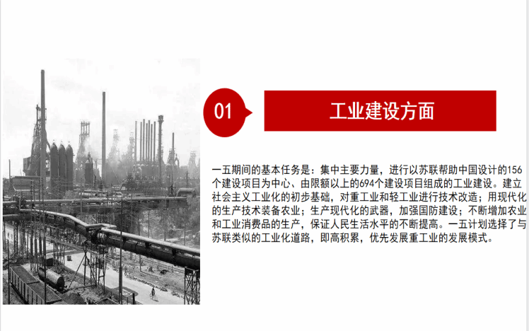 经过新中国成立后三年的努力,我国基本实现了政治、经济、社会的稳定,为了准备进行有计划有准备的经济建设,我国从1951年开始着手编制第一个5年计划。1953年起,一面开始实施,一面继续完善。1953年6月14日至8月13日,中共中央召开全国财经工作会议,围绕贯彻执行过渡时期总路线,讨论修改第一个5年计划。1955年7月1届全国人大二次会议正式审议通过一五计划,较好的处理了我国经济建设中的几个重大关系,提出集中主要力量发展重工业同时不放松农业新工业,对国民经济各部门统筹兼顾,全面安排科学进行工业布局,改变我国工业大多集中在沿海地区的不平衡状况,根据我国国力积极稳妥确定工业农业生产年均增长速度,把发展生产改善人民生活恰当的结合起来,既要争取外援,同时又强调自力更生,国家建设应以国内力量为主,这些对于后来我国经济建设具有深远指导意义。在那个激情燃烧的年代,工人、农民、知识分子迸发出从未有过的热情,各条战线喜报频传。1953年底,鞍山钢铁公司大型轧钢厂等三大工程建成投产;1956年,第1辆汽车生产下线,第1架喷气式飞机试制成功,第1个机床制造厂建成投产;1957,年武汉长江大桥连通长江南北,川藏、青藏、新藏公路相继通车,限额以上的较大项目平均每天有一个开工或竣工。至1957年底,各项经济建设指标一般都大幅度超额完成,人民生活水平逐步提高。5年间工业生产取得的成就,远远超过旧中国的100年,新中国迅速从废墟上站起,为我国建立独立完整的工业体系奠定了基础,为社会主义建设积累了宝贵经验。