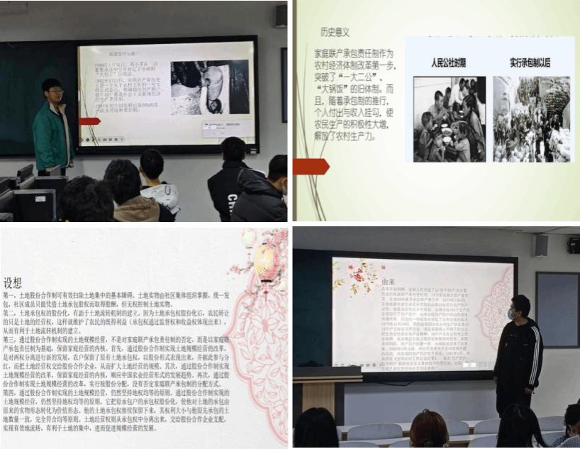 2022级软件工程4班的李松涛讲到家庭联产承包责任制的背景:文化大革命结束后,中国国内社会动荡,生产力始终没有得到恢复。大跃进”和人民公社化运动使“左倾”错误严重泛滥开来,造成国民经济比例严重失调,导致国民经济困难。高级合作社和人民公社化,脱离中国农村生产力发展的实际水平,加上高度集中的劳动方式和分配中的平均主义,影响农民生产的积极性,农村经济的发展受到约束。软件工程6班的许文泽讲到家庭联产承包责任制的历程:1978年11月24日晚上,安徽省凤阳县小岗村18位农民签下“生死状”,将村内土地分开承包。开创家庭联产承包责任制的先河。当年,小岗村粮食大丰收。1980年5月31日,邓小平在一次重要谈话中公开肯定小岗村“大包干”的做法。当时国务院主管农业的副总理万里和改革开放的总设计师邓小平对这一举动表示的支持传达一个明确的信息:农村改革势在必行。在那之后,全国大兴承包,政府鼓励百姓耕种 广大农村地区迅速摘掉贫困落后的帽子,逐步走上富裕的道路,中国因此创造令世人瞩目的用世界上7%的土地养活世界上22%人口的一次奇迹,这也是中国农村发展史上,永远值得被铭记的一次改革。
