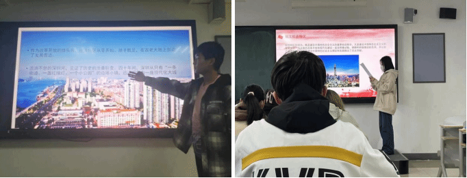 2022级电商2班王若菡同学介绍了四十年间经济特区的历史成就。40年来,经济特区披荆斩棘,蓬勃发展,成为充满魅力、动力、活力、创新力的国际化创新型城市。经济特区建设的成功实践,是对“改革开放是决定当代中国命运的关键一招,也是决定实现‘两个一百年’奋斗目标、实现中华民族伟大复兴的关键一招”的生动诠释。