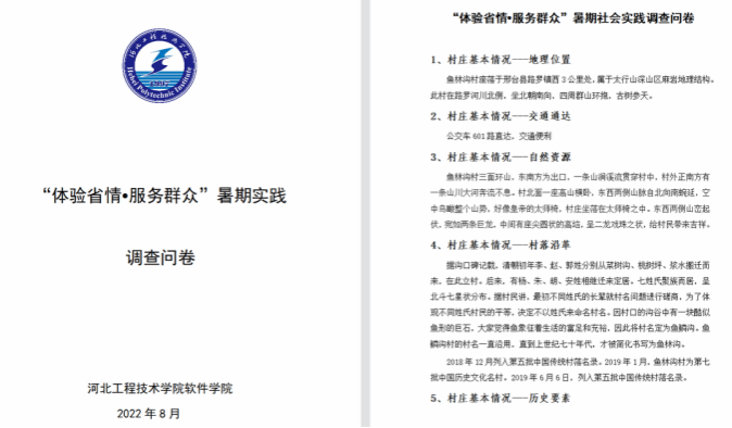 本次暑期社会实践“软件一夏 考古未来”实践团队以“体验省情●服务群众”为主题,立足于对传统古村落文化的弘扬和传承,对河北省内国家级历史古村落进行了深入调研,在数字化时代大潮下,运用互联网思维尝试古村落的保护、利用与发展。在实践中传承耕读古村落文化,赋能乡村振兴,以实际行动迎接党的二十大胜利召开。
