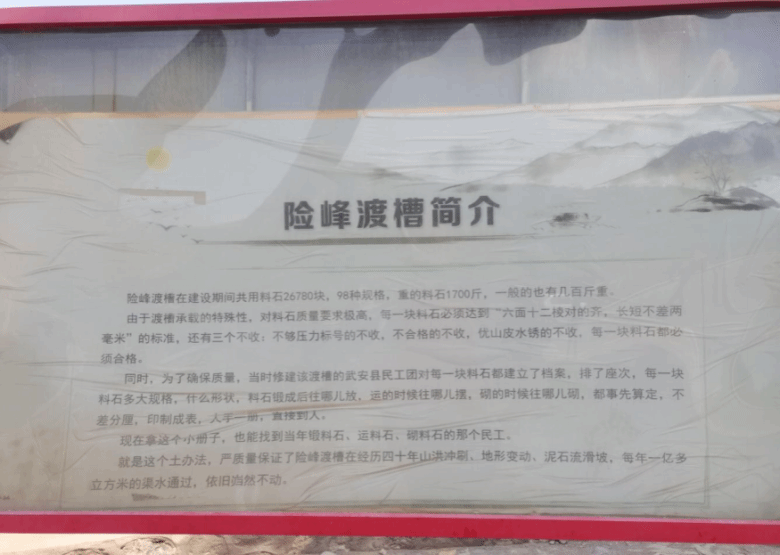 险峰渡槽凭借着全长210米,高32.3米的体量,保持着“单拱跨度亚洲之最”的美誉。全长210米,高32.3米,是磁县跃峰渠水利工程中一个极其重要的组成部分,至今仍然发挥着重要的作用!险峰渡槽也是第五届邯郸市旅发大会观光景点其中之一,主要景观节点有:险峰渡槽施工遗址、七彩花田、“跃峰渠精神”文化展示墙……,它融合展示红色记忆,增强红色精神内涵和独有特质,对于宣传磁县红色历史具有重要作用,也是我们学习跃峰渠精神无论如何也无法绕过的地点。