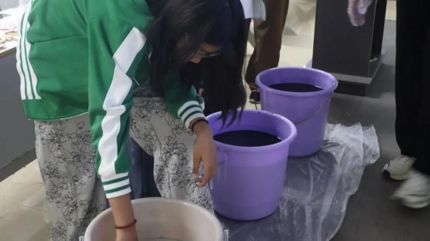 彩线盘结藏巧思,素绢晕染绽奇花。本次活动以传统手工艺体验为核心,让参与者沉浸式感受扎染技艺的文化底蕴与艺术魅力。学生们聚精会神地学习扎染的历史渊源、捆扎技法等基础知识,这些知识为之后的实践环节打下了坚实的基础。学生们开始挑选棉线与布料,精心设计着每一处纹样布局,并通过折叠、捆扎、缠绕等方式将布料塑形。