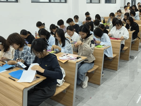 工作人员播放不织布手工制作视频并分发不织布、剪刀、彩笔等材料。面对各色不织布与创作工具,大家热情高涨却又有些不知所措,有人对姓名牌造型设计犹豫不定,有人在色彩搭配上举棋不定。很快,现场便涌现出互助友爱的热闹场景:手工创作熟练的同学主动分享裁剪、拼接技巧;擅长创意设计的同学则帮忙出主意、挑选布料。待姓名牌作品完成,同学们迫不及待地展示成果,把创意满满的作品摆放在展示区,拉着新认识的伙伴从不同角度欣赏。每一块姓名牌都凝聚着新生们的巧思与心意,尽显手工创作的趣味与初入校园的真挚情谊。