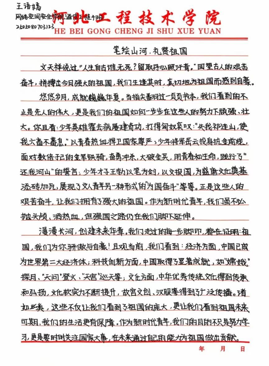 为深入学习贯彻爱国主义精神,引导当代大学生厚植家国情怀、增强文化自信,2025年10月9日,网络空间安全学院大学生自律委员会在7-105,收集学生征文作品,成功开展“笔绘山河,礼赞祖国”主题的国庆征文活动,活动吸引了众多同学参与报名。