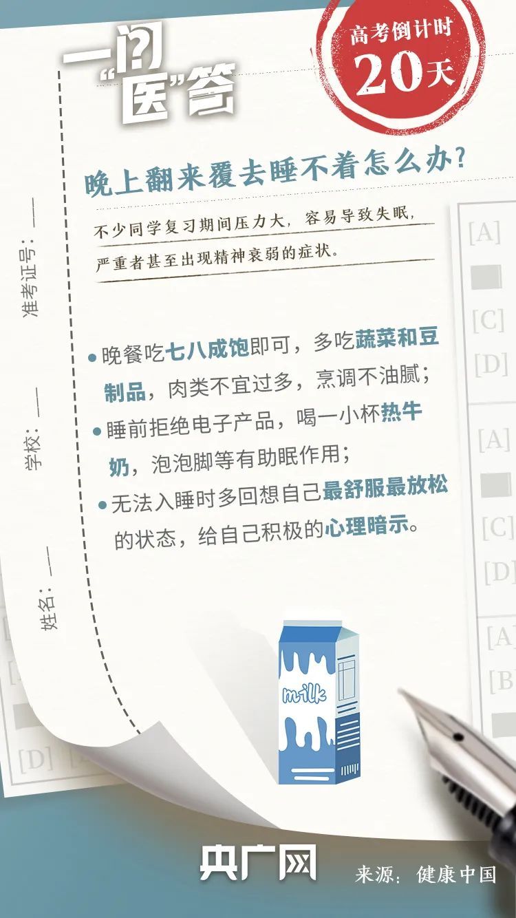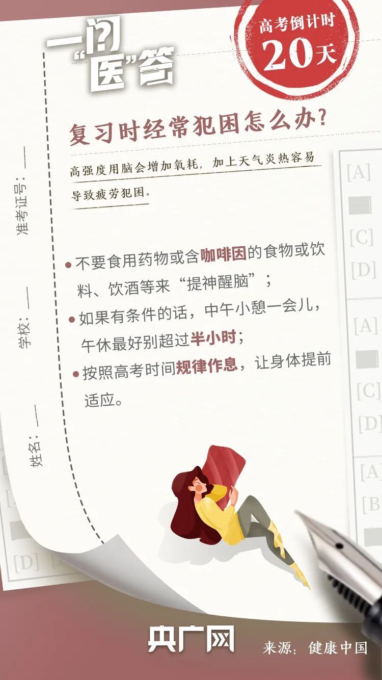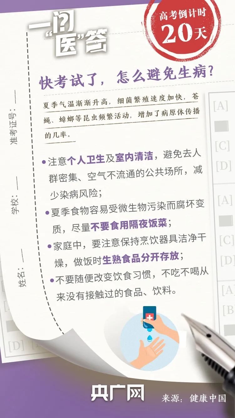 距离2023年全国高考还有20天,炎炎夏日,临近考试,不少考生都会出现焦虑、食欲下降等情况,收藏好这份健康小贴士,助你顺利备考!