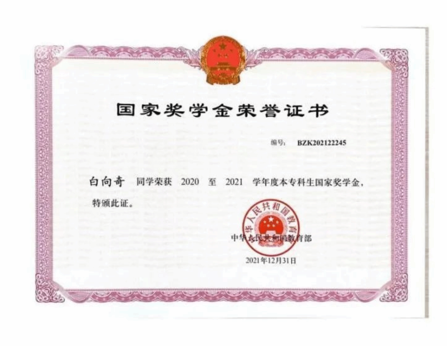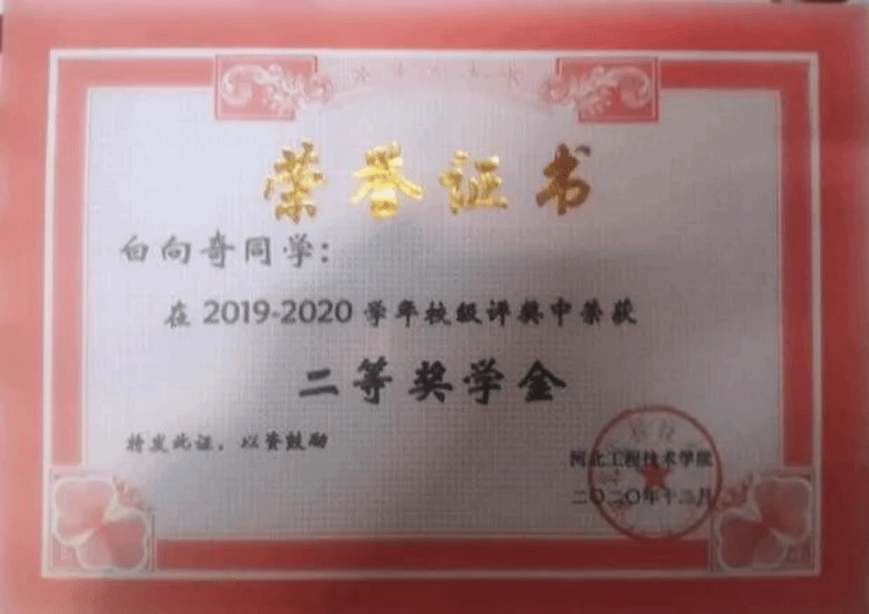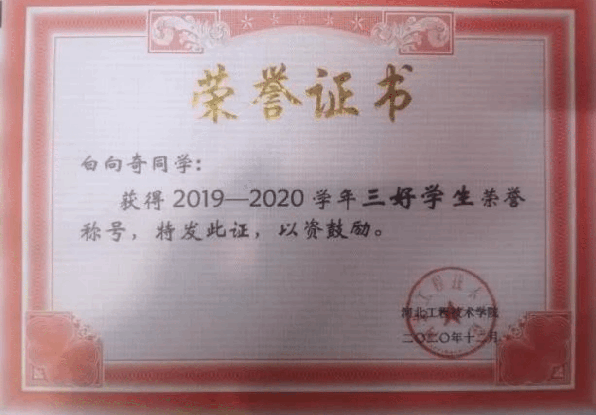白向奇,男,满族,1997年3月生,共青团员,taptap点点官方网站软件学院18级学生。曾获国家励志奖学金,“三好学生”荣誉称号,“优秀学生干部”荣誉称号,校二等奖学金。2020年11月在学校开展的退役士兵表彰大会中,荣获“部队服役荣誉证书”。