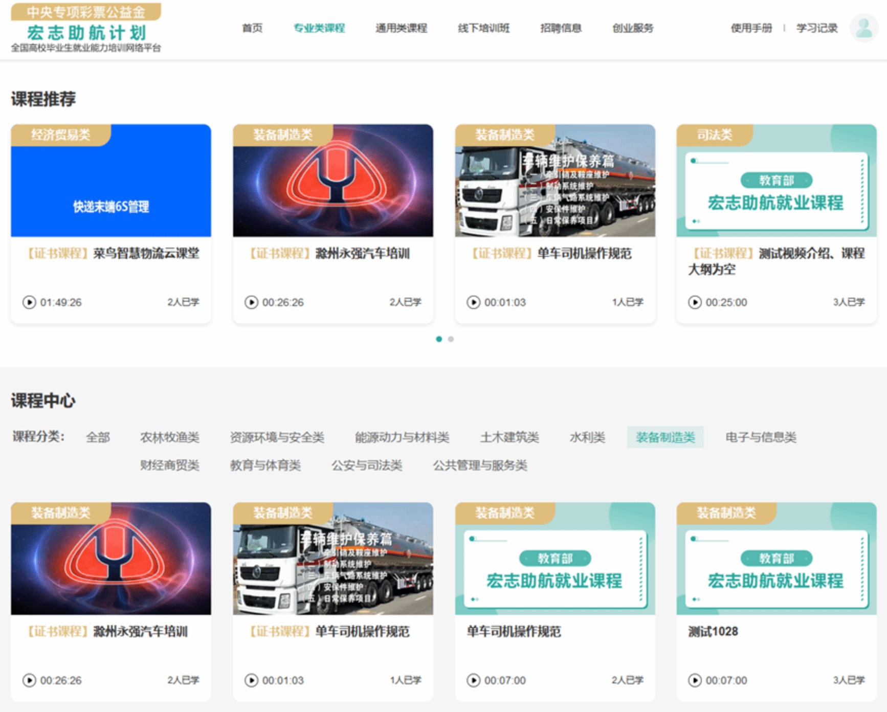 培训包括通用类课程和专业类课程两个大类。通用类课程包括就业指导和宏志案例两个主题。专业类课程按行业大类细分不同主题,涵盖高校毕业生就业的主要行业和领域。
