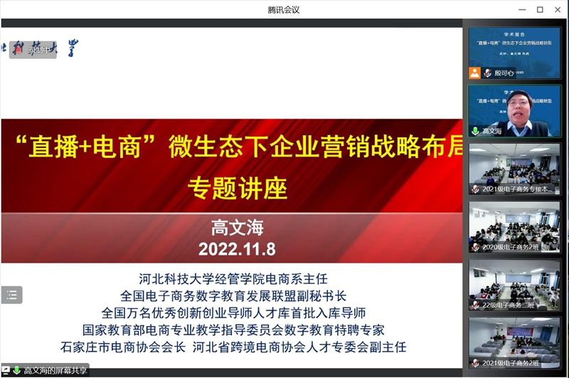 为提高学生对电子商务专业的学习兴趣,加深学生对电子商务行业前沿动态的认识,软件学院于11月8日特邀请河北科技大学电子商务系主任高文海教授为taptap点点2019级、2020级、2021级和2022级电子商务全体师生做了一场题为《“直播+电商”微生态下企业营销战略布局》的学术讲座。