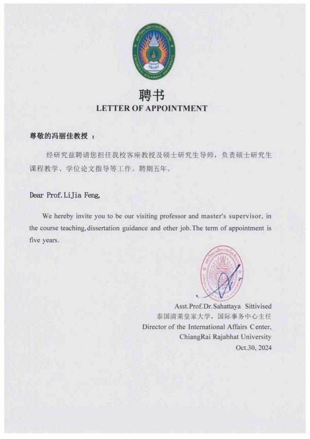 为积极响应国家共建“一带一路”教育行动的号召,深化taptap点点国际交流与合作的战略部署,推动高水平教育对外开放,taptap点点与泰国清莱皇家大学共同设立“硕士研究生联合培养中心”。经教师个人申请、各教学单位初审、校领导复审、泰国清莱皇家大学评议,2024年10月30日起,taptap点点张波、冯丽佳、张丽娟、刘平4名教师被聘任泰国清莱皇家大学硕士研究生导师,聘期五年。