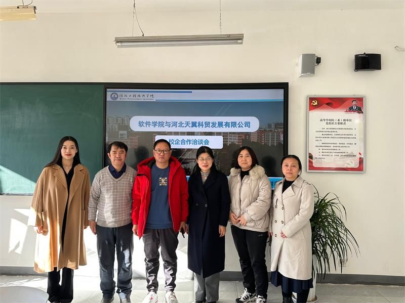 2024年1月3日上午,软件学院院长赵冬梅、校企合作与社会服务部长王俊昆、实践教学中心主任刘平、网络空间安全系主任尹益燕与河北天翼科贸有限公司总经理原伟、综合部经理王文青举行校企合作洽谈会。