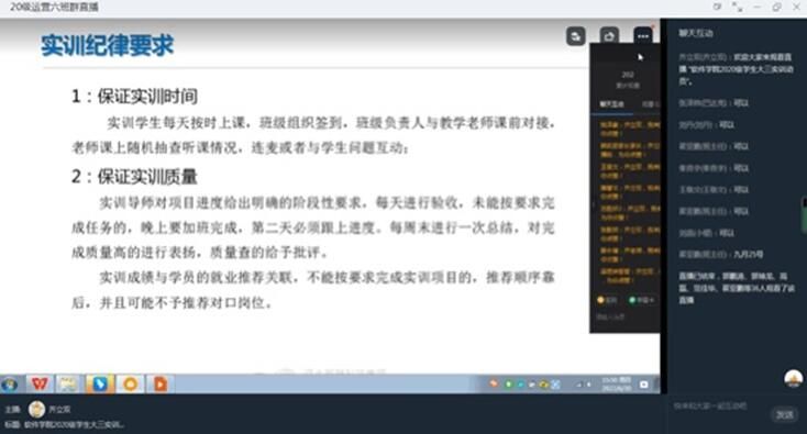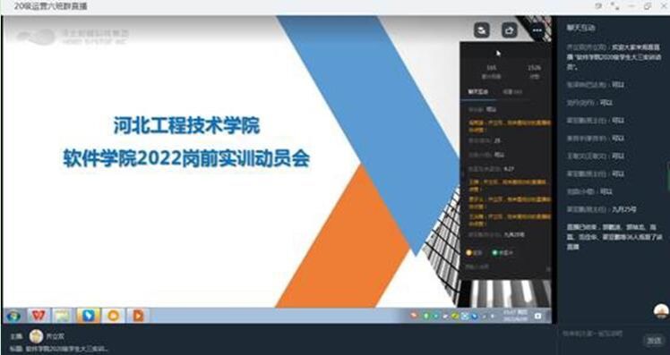 岗前实训是软件学院学生对自己大学前一阶段理论知识梳理与实践的重要环节,更是夯实个人专业技能、备战就业的关键阶段,为使20级专科学生认识、深入了解岗前实训,提升学生对本次实训的重视,激发学生对实训的期望热情,了解实训的具体细节,实训开始之前,软件学院职业引导师组织20级专科进行了线上实训动员会全方位介绍最后一学年实训的教学、管理、数据核对等各项实训细节,确保实训顺利开展。