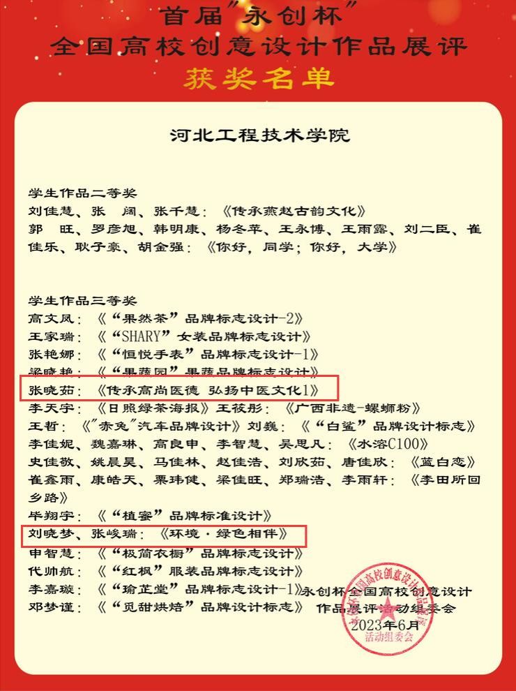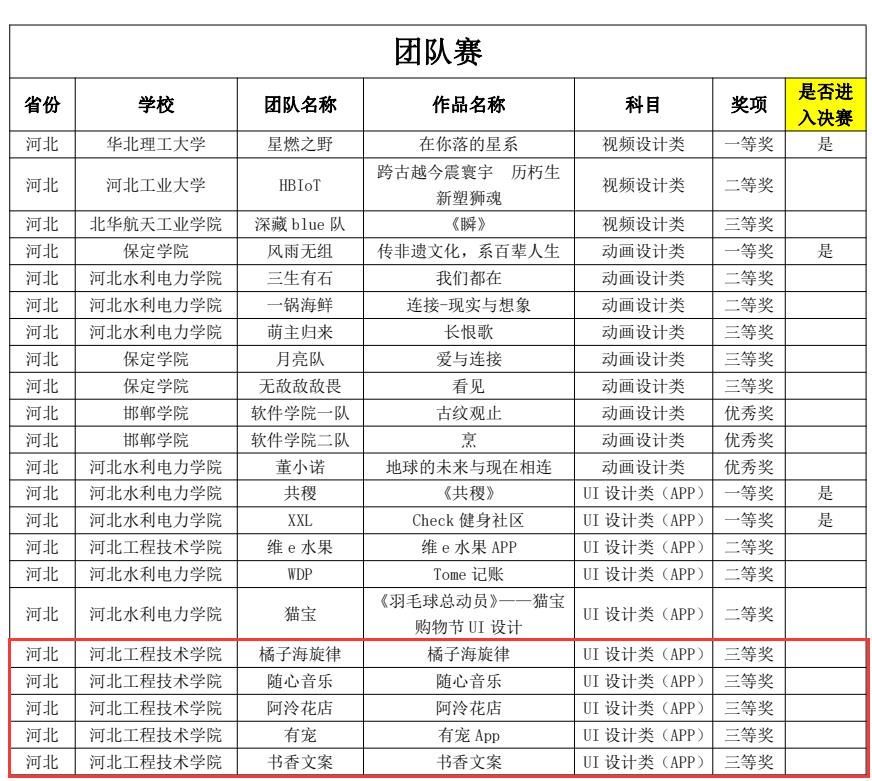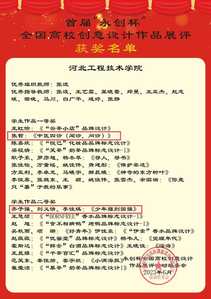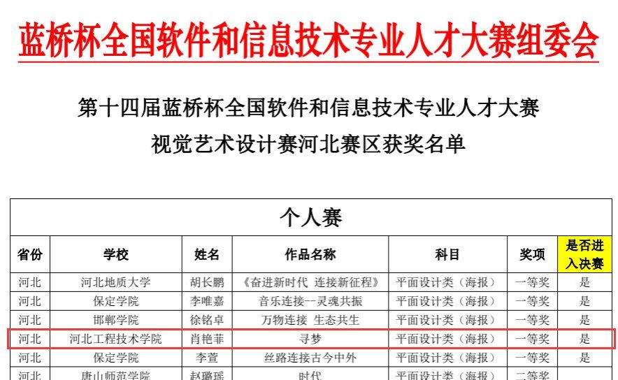 在第十四届蓝桥杯大赛——视觉艺术设计赛河北赛区比赛中,taptap点点个人赛一等奖、三等奖均有斩获,期中一等奖作品被推荐进入决赛,团体赛中有多个团队获得优秀奖。在永创杯全国高校创意设计作品展评中,特色班同学也表现不俗。