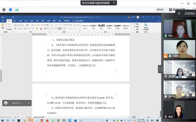 本次评审工作,由冯丽佳老师进行主持,评审委员包括张波、李玮玮、宋红梅、雷迪等教师代表。首先冯老师对本次比赛的目的、学生作品的评分标准进行说明。接着对学生作品进行一一展示,最后由评审委员进行线上打分。