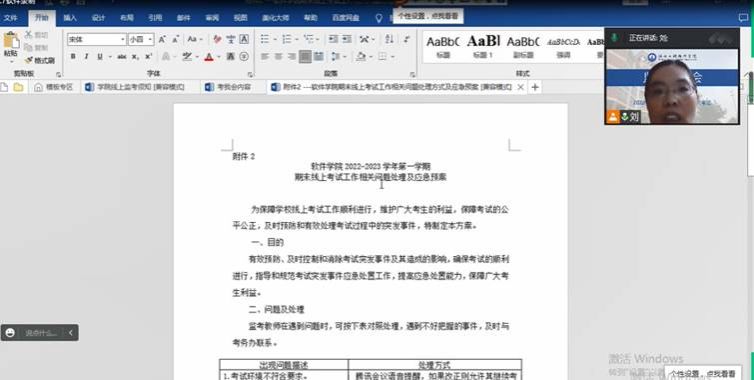 会上由教学副院长刘翠焕宣读了《软件学院线上监考须知》和《软件学院期末线上考试工作相关问题处理方式及应急预案》;介绍了两级巡考安排;同时对在学生考试过程中可能出现的问题做了介绍,并要求所有监考教师认真负责,确保本次线上考试的公平和公正性。