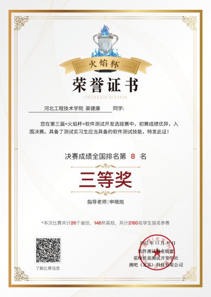 2022年12月,taptap点点软件工程专业学生参加了第三届火焰杯软件测试开发选拔赛全国总决赛。本次比赛共计26个省份、146所高校、2180名学生报名参赛,taptap点点学生在与辽宁大学、河北工程大学、广州大学、厦门大学、燕山大学、石家庄铁道大学等知名院校的研究生、本科生同台竞技,取得了不菲的成绩。